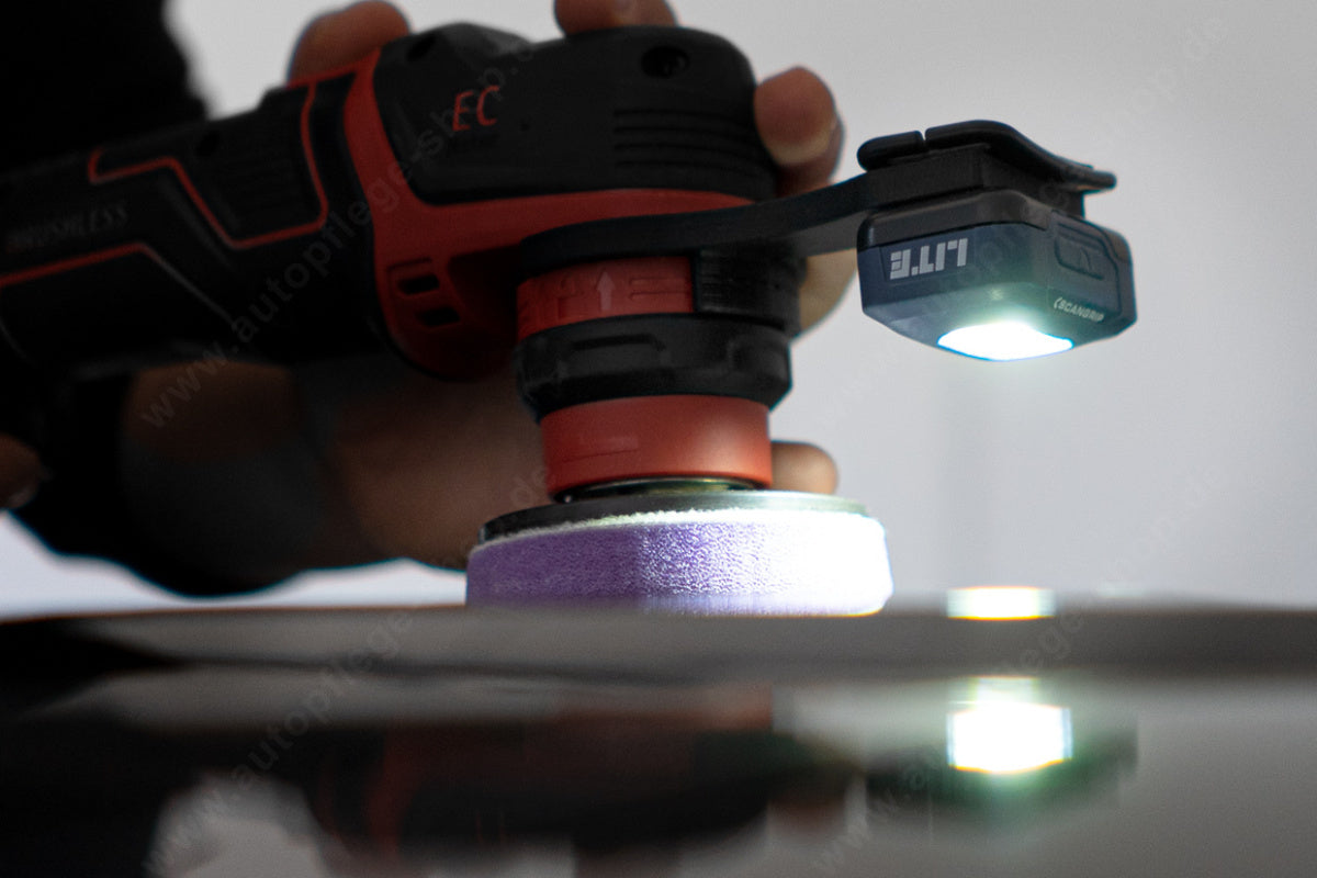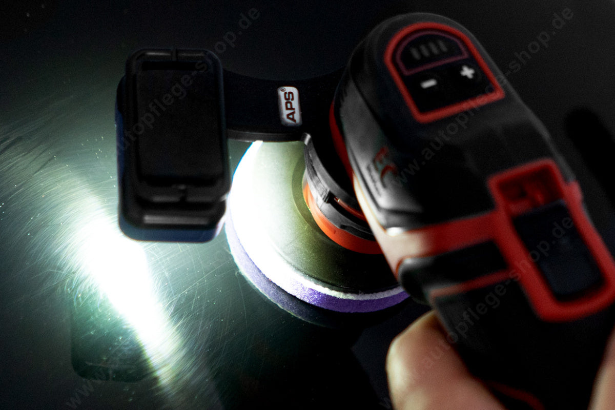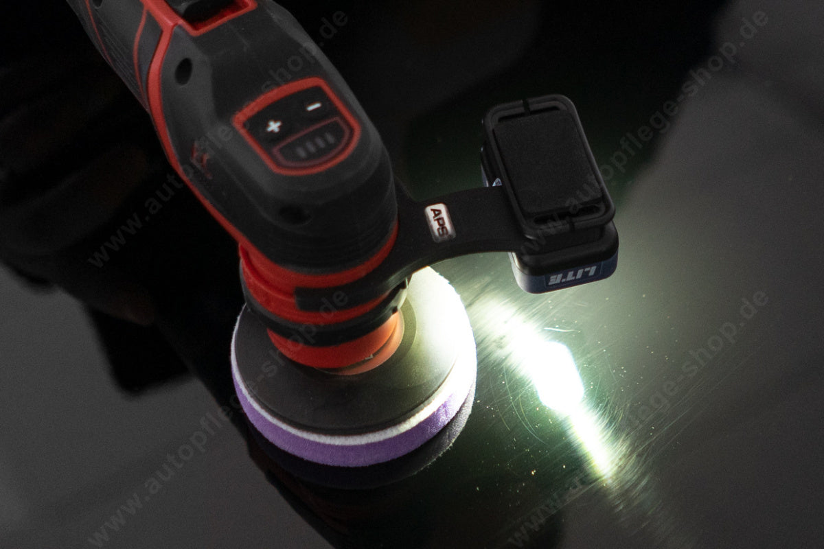 APS FSL Micro is the brand new, innovative holder for attaching the Scangrip HEAD LITE S to the Flex PXE80 - flexible and professional illumination of the polishing area! The holder is clipped onto the gear apron of the Flex PXE80 and can be swiveled as desired within a large angle range. This allows the APS FSL to provide precise and reliable illumination of the polishing area in the immediate vicinity of the polishing pad.