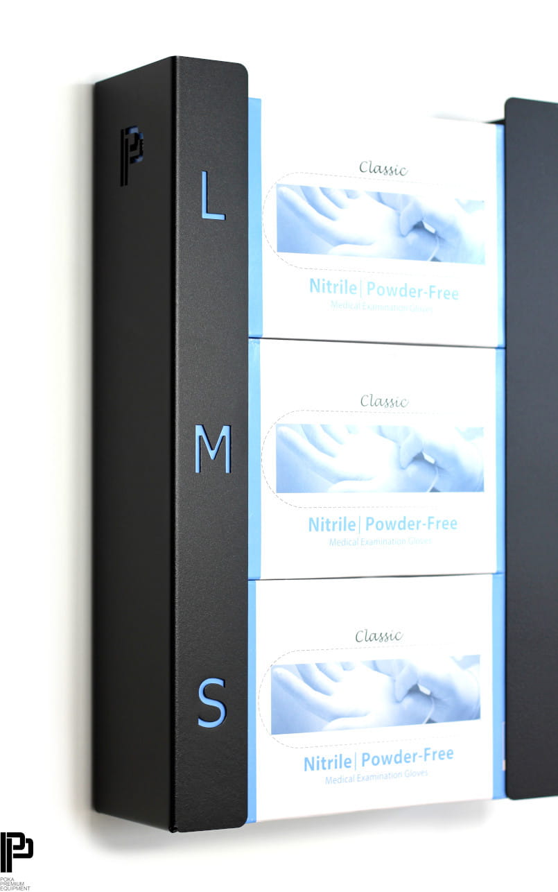 A high-quality, metal hanger for 3 glove Boxes with L / M / S size inscription. Made of the best quality and technology structural steels covered with a thick layer of zinc to protect against rust and corrosion. The hanger was finally painted on both sides with high-quality powder paint with a finer structure that provides protection against scratches and fading. A hanger secured in this way will serve you for many years, even in the most difficult conditions.